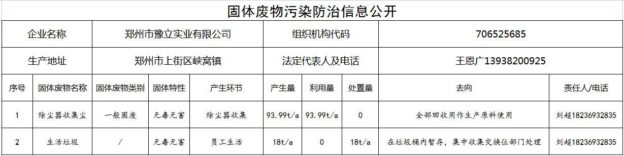 鄭州市豫立實業有限公司固體廢物污染防治信息公開...